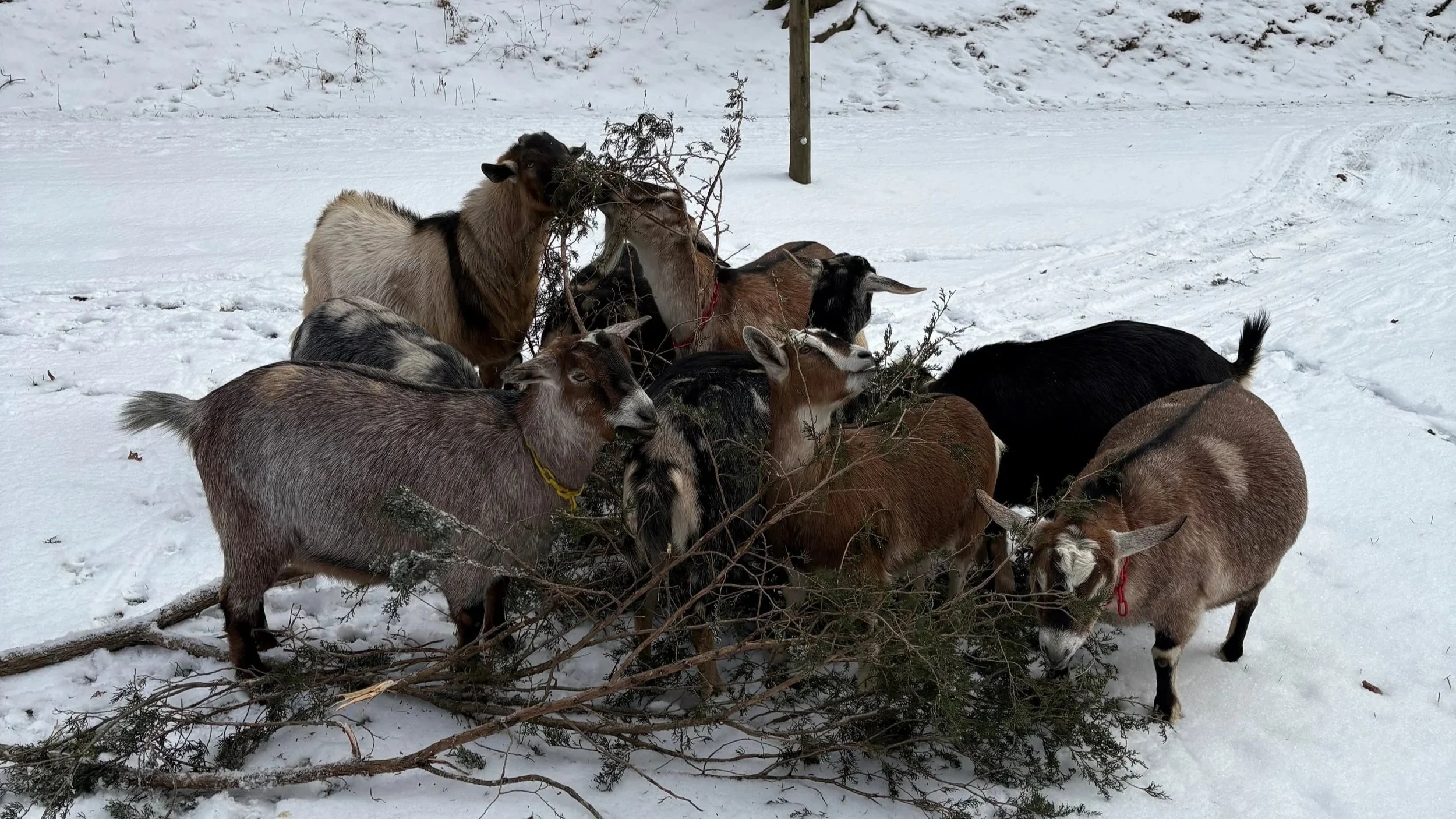 The herd ranges some... more on mild days. On freezing and snowy days, I drag them branches that have come down as a result of the wintry weather.